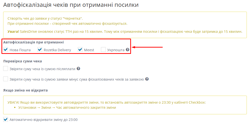 У налаштуванні інтеграції з Checkbox можна включити автофіскалізацію при отриманні для всіх служб доставки: