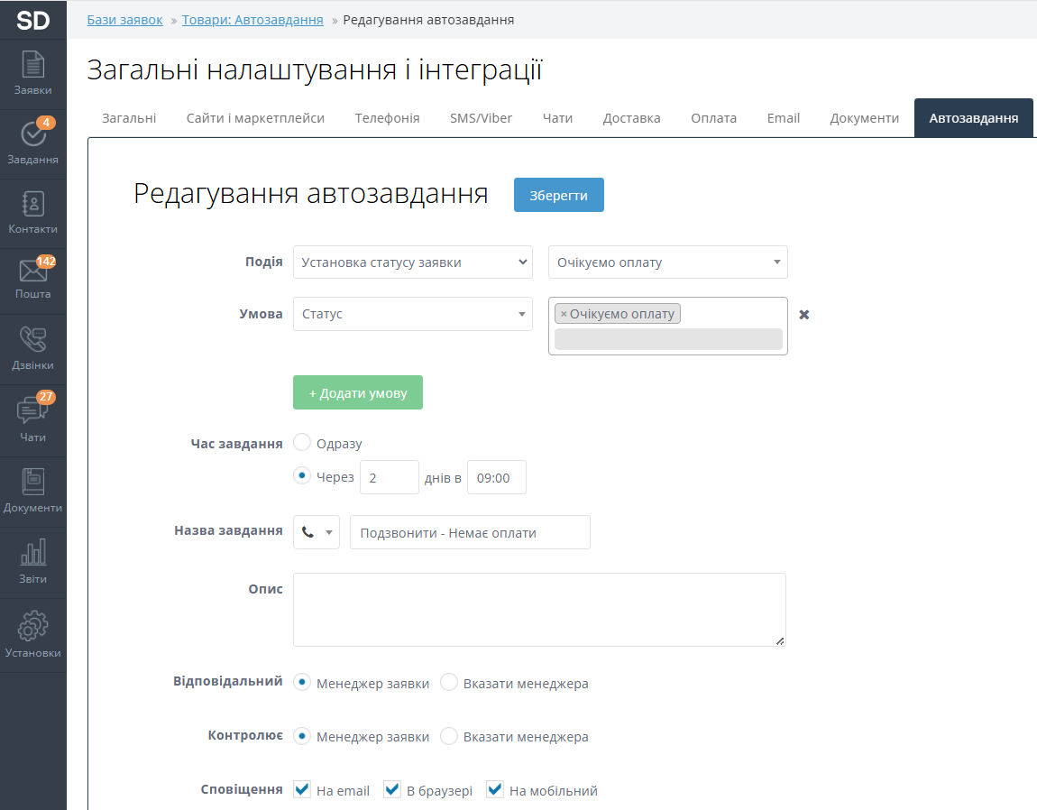 Наприклад, для події зміни статусу на "Очікує оплату" ви можете встановити умову "Статус = Очікує оплату" для завдання через 2 дні. Завдання створиться за умови, що після переведення в статус "Очікує оплату" - через 2 дні заявка досі буде в статусі "Очікує оплату".