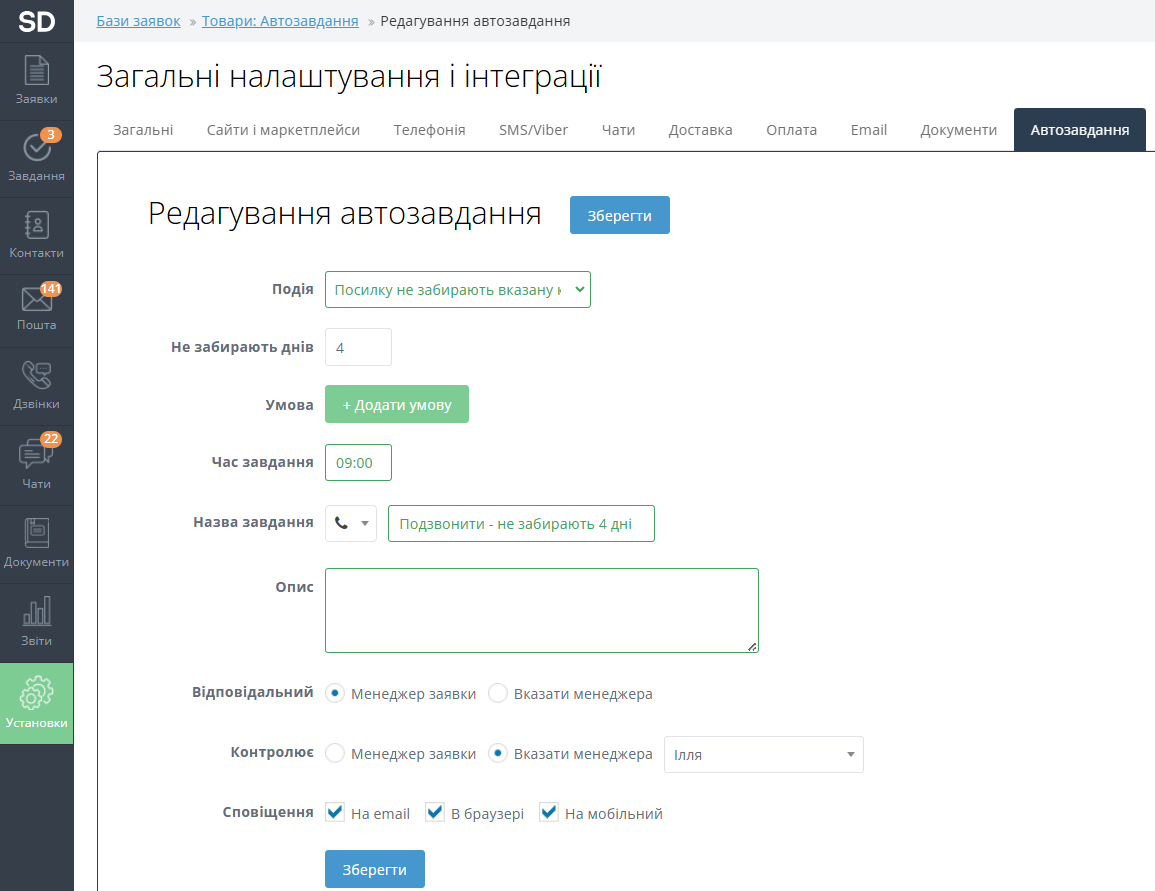 SalesDrive дозволяє формувати автозавдання при подіях: