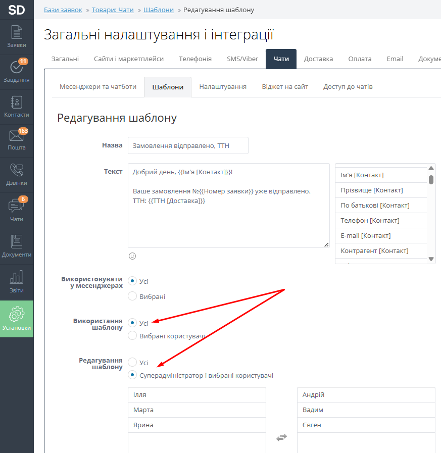 В шаблонах чатів можна вказати, які користувачі можуть редагувати, а які користувачі можуть використовувати даний шаблон.