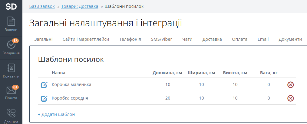 Установки → Загальні налаштування і інтеграції → Доставка → Шаблони посилок