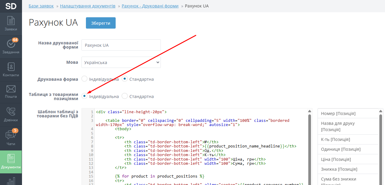 У друкованих формах документів (рахунки, видаткові накладні тощо) - додали можливість налаштувати індивідуальний шаблон для блоку з товарними позиціями: