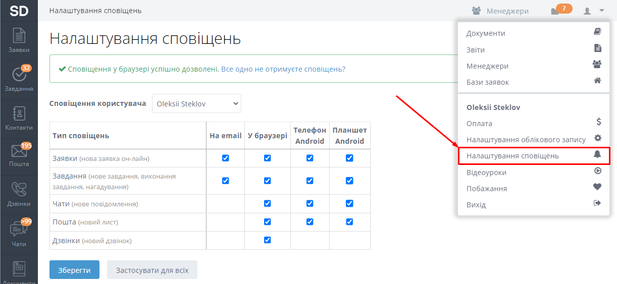 Для кожного користувача ви можете налаштувати сповіщення на емейл, у браузері та в мобільний додаток на телефоні чи планшеті.