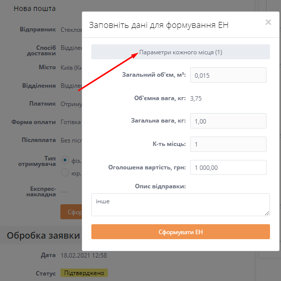 Щоб передати в Нову Пошту дані, що сторона коробки - більше 70 см, ви повинні вказати "Параметри кожного місця":