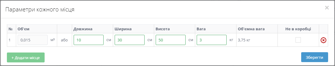 В параметрах кожного місця вказуються довжина, ширини, висота та вага: