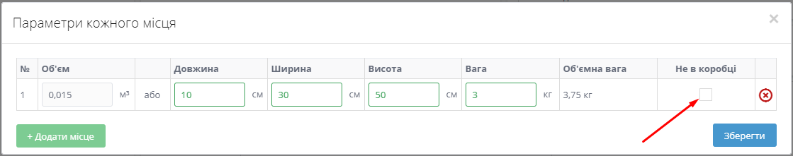 Якщо ви вказуєте параметри кожного місця, то галочка "Не в коробці" відображатиметься напроти кожного місця: