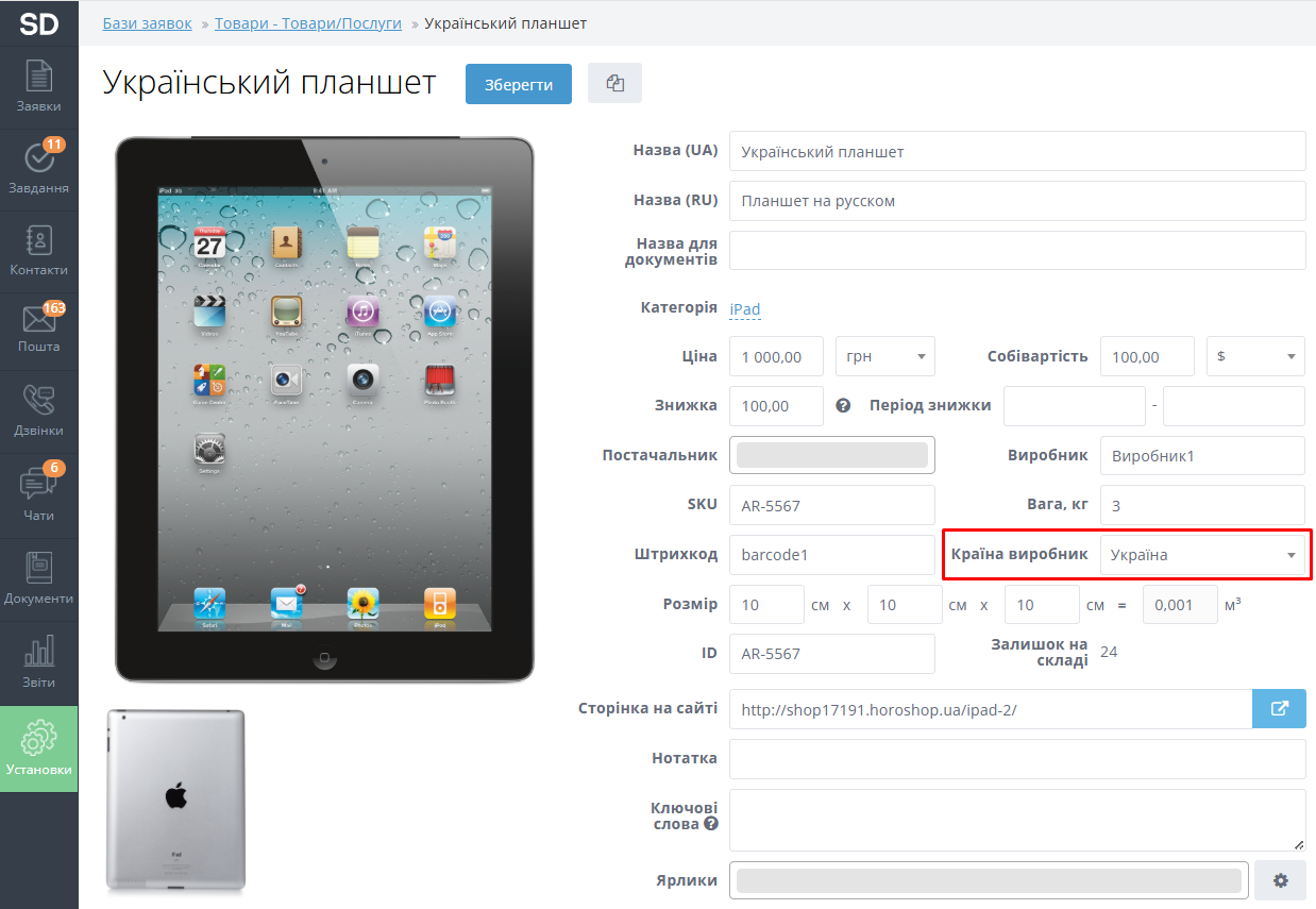У картці товару додали поле "Країна виробник".