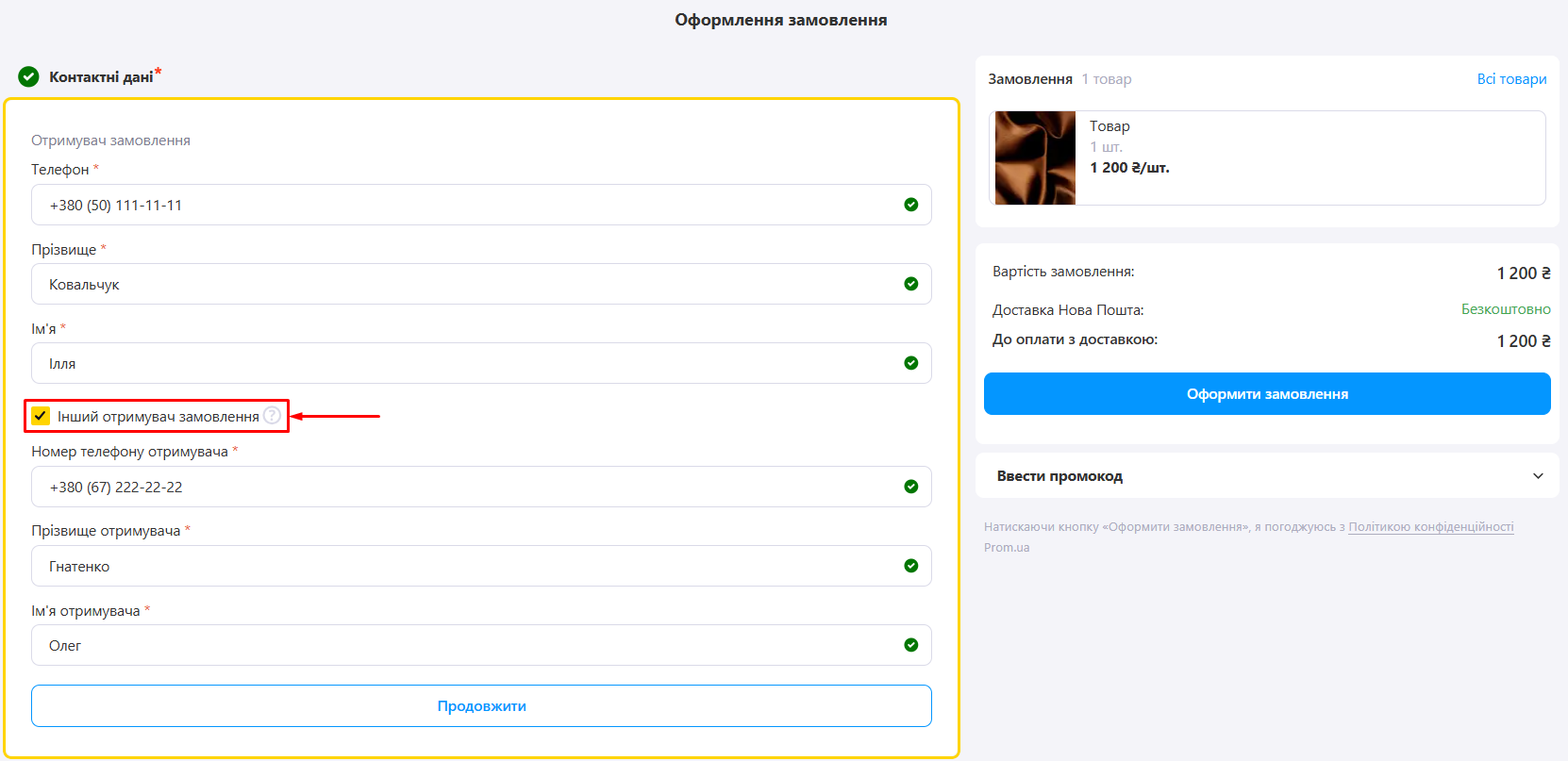 Prom нещодавно додав можливість вказати отримувача відмінного від замовника.