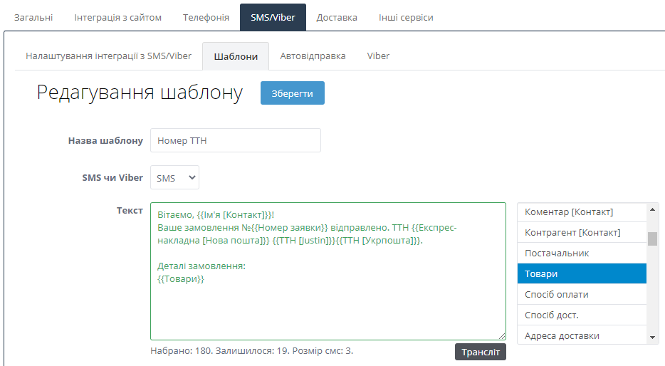 В шаблони та автовідправку SMS і Viber з'явилася можливість додати підстановку товарних позицій.