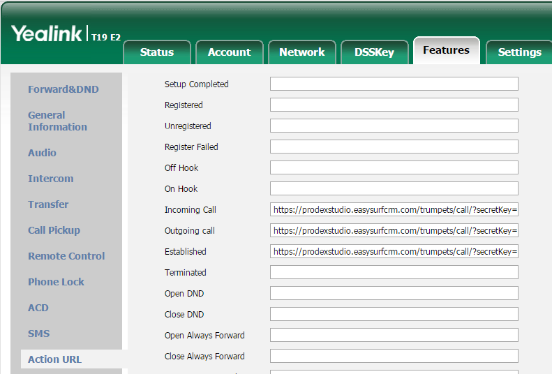 В налаштуваннях IP-телефону перейдіть у вкладку "Features" і в лівому меню виберіть "Action URL".